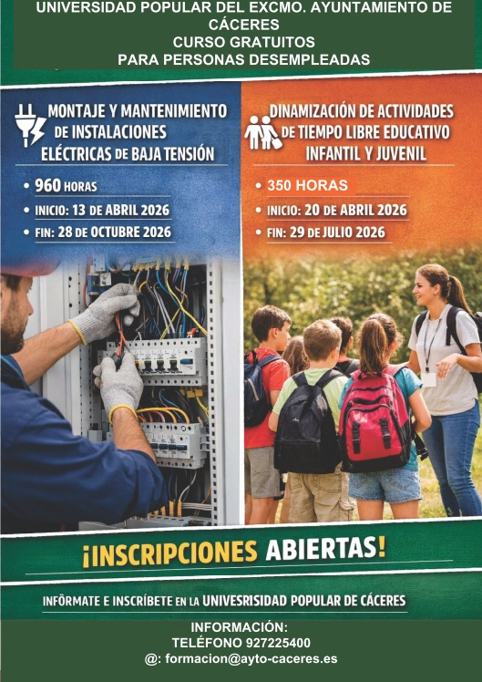 más información en el teléfono: 927225400 y en el e-mail: formacion@ayto-caceres.es